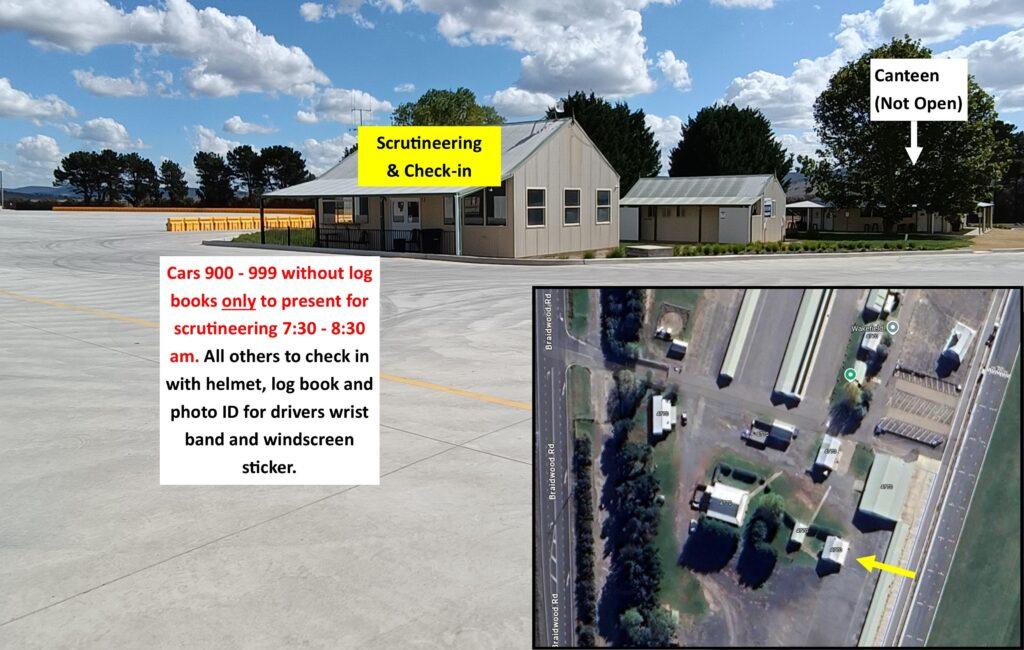1. All Championship competitors (ie all those with race numbers 4-899) and all others whose vehicle has a Motorsport Australia Log Book are to check in at the Scrutineering Building (pictured below) for your scrutineering windscreen sticker and drivers wrist band prior to competition commencing.